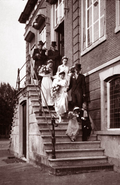 Erp 1943 > Trouwen met Roos Roos en Wim trouwen in Erp, waar de familie Brouwers vandaan komt. F-0081 Van boven naar beneden > Vader en Moeder Brouwers (ouders van Roos), Drientje Wijnakker, Paula Brouwers, Roos Wijnakker-Brouwers, Wim Wijnakker, Anneke en Frans Brouwers als bruidskindjes. |