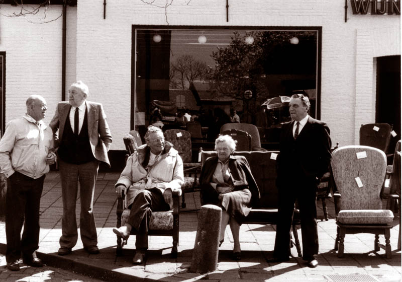 | Wim Wijnakker Seniorenfeauteuils, rond 1986 Deze foto is geloof ik ooit gemaakt door Gerard Faassen, lid van de fotoclub en overbuurman van Wim Wijnakker Senioren-feauteuils. Zoals je ziet wordt er vooral met oude vrienden gekletst en niet zozeer iets verkocht. (aan de spiegeling in de ramen te zien is de foto gemaakt tijdens de braderie of zo...) F-0119 > Van links naar rechts: Cees de Zeeuw, Cees van Son, Wim Wijnakker, Truus van Dorst, Jas van Dorst. |