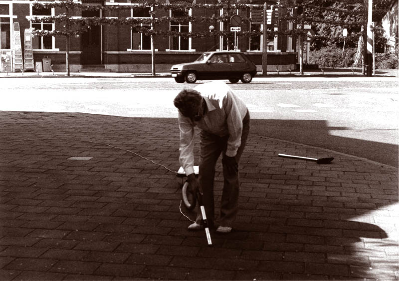 | Even de stoep stofzuigen Ik geloof dat deze foto ooit de cover van 'Het nieuw geluid' heeft gehaald... Even netjes de stoep stofzuigen. Er werd nog een foto blijgeplaatst van Wim die geniet van een milkshake van Tino, op het bankje bij de dorpspomp, lekker in het zonnetje. Zoiets... Een beetje gek natuurlijk om de stoep te stofzuigen, maar ja, met 22 jaar ervaring als nar had ie wel aanleg om een beetje gek te zijn... De T-splitsing is inmiddels een driehoek geworden, maar de trappen staan nog elke dag buiten bij Schoppema. F-0121 > Wim Wijnakker |